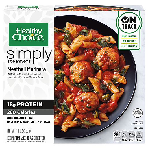 Healthy Choice Simply Steamers Meatball Marinara satisfies your cravings with quality ingredients. Savor a quick and delicious meal from the microwave anytime. This dish combines 100% natural* meatballs, whole grain penne pasta and chopped spinach in a zesty Parmesan marinara sauce for a meal that's as flavorful as it is healthy. Made with nothing artificial, this single-serve meal is GLP-1 friendly with 18 grams of protein, 6 grams of fiber and 280 calories to help you stay on track. Perfect for a quick lunch or dinner after a long day, keep this delicious ready-made meal in your freezer to always have healthy meals on hand.