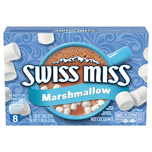 Swiss Miss Chocolate Hot Cocoa Mix With Marshmallows makes a warm, delightful hot cocoa drink with mini marshmallows that will bring you comfort and everyday warmth whenever you need it. This hot cocoa drink mix easily transforms into a rich, creamy hot cocoa with marshmallows that delivers on that timeless flavor your family has always known and loved. Swiss Miss Hot Cocoa Mix is packaged in individual packets so every mug you make is equally delicious. You won't miss your old hot chocolate with marshmallows. This chocolate hot cocoa powder is made with real cocoa and nonfat milk to give you that comforting, rich and creamy taste you expect from Swiss Miss. Not only is this a gluten free hot cocoa mix, but it's made with no artificial sweeteners, preservatives, flavors or colors. Preparing a delicious mug of this hot cocoa is easy. Empty the chocolatey cocoa mix into a mug, add 8 ounces of hot water (or milk for a richer taste) and stir. Enjoy a mug as part of your morning routine, on chilly days or as a sweet evening treat. You can use this cocoa mix in different ways. Try making a tasty iced cocoa drink to cool you down, or incorporate the hot cocoa mix into your recipes for brownies, cookies, cakes and more. Whatever you’re warming up to, know that Swiss Miss will give you everything you need in the palm of your hands.